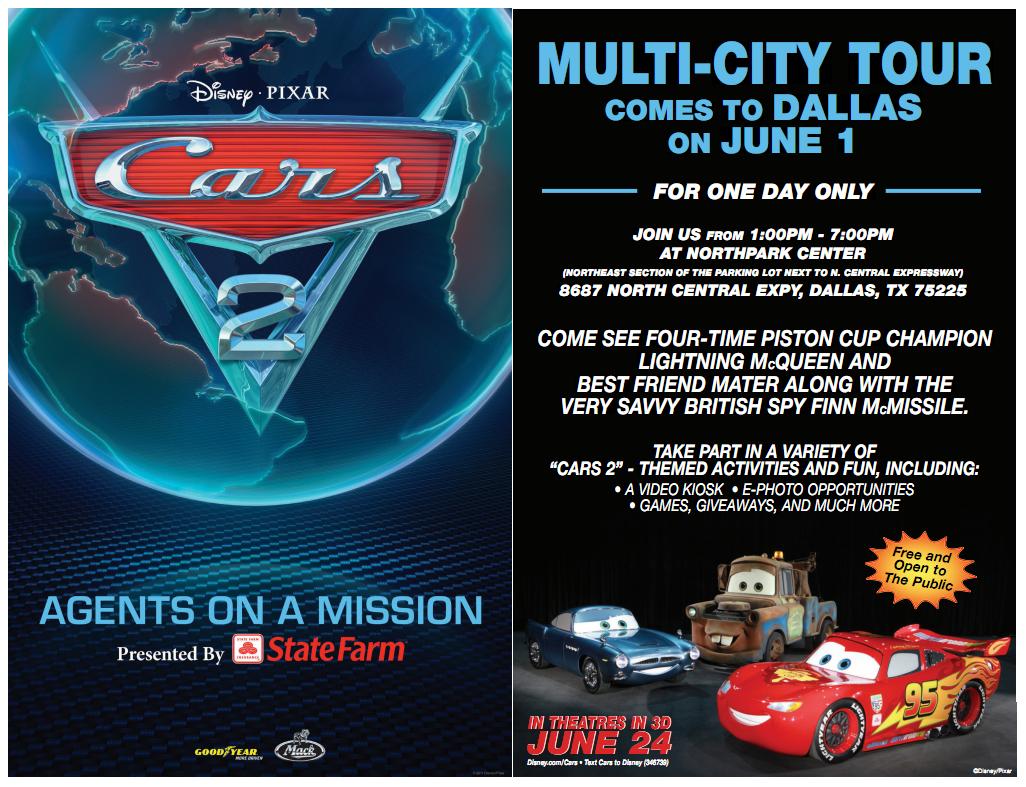 Wednesday, June 1, 2011 at NorthPark Center Come see four-time Piston Cup Champion Lightning McQueen and best friend Mater along with the very savvy British spy Finn McMissile! Take part in a variety of Cars 2- themed activities and fun including a video kiosk, e-photo opportunities, games, inflatable obstacle course, giveaways and much more!