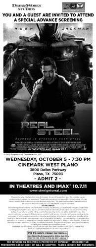 Go,See,Talk is partnering with DreamWorks Pictures to give 75 Dallas area film fans FREE passes (good for you +1 guest) to an “Advance Screening” of Real Steel before it hits theaters.