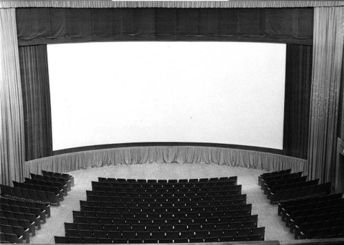When I was growing up, we had two Cinerama theatres in the city. (Those who don’t know what Cinerama is – look at the photo of the movie screen up above, and imagine a larger, wider one that’s even more sharply curved. Imagine a picture that big. Then imagine that all the sound, not just the music, the offscreen voices, or the sound effects, is completely directional, corresponding exactly to where the actors are located onscreen. That is Cinerama, and it is better than Imax.