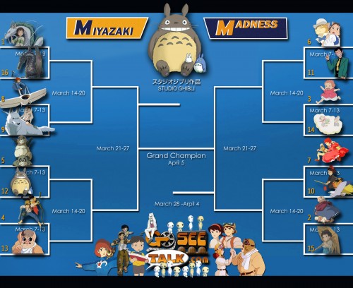 OK friends, we are just one day away from the big show. I’ve evaluated all the films, taken reader emails into consideration and now have the rankings for “Miyazaki Madness“. Below is the bracket for the start of the tournament. Tomorrow we start voting and I can’t wait to see the results! Have a look at the match-ups and click the image below for a hi-rez version of the brackets.