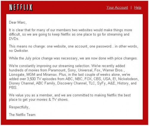 The beauty of the initial model is obvious; one stop shopping and VARIETY. Going the “separate ways” route would serve nothing but to alienate fans, even those who stayed on and were willing to pay a little more. Mr Swasey went on to say that “Consumers value the simplicity Netflix has always offered and we respect that. There is a difference between moving quickly — which Netflix has done very well for years — and moving too fast, which is what we did in this case.” So I guess it’s ironic, in regards to that comment, that the spin-off company was to be called Qwikster, don’t ya think?