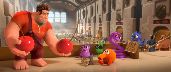 Wreck-It Ralph adopts a more charitable persona as he offers cherries from a Pac Man game to the out-of-work characters from an unplugged Q*bert.