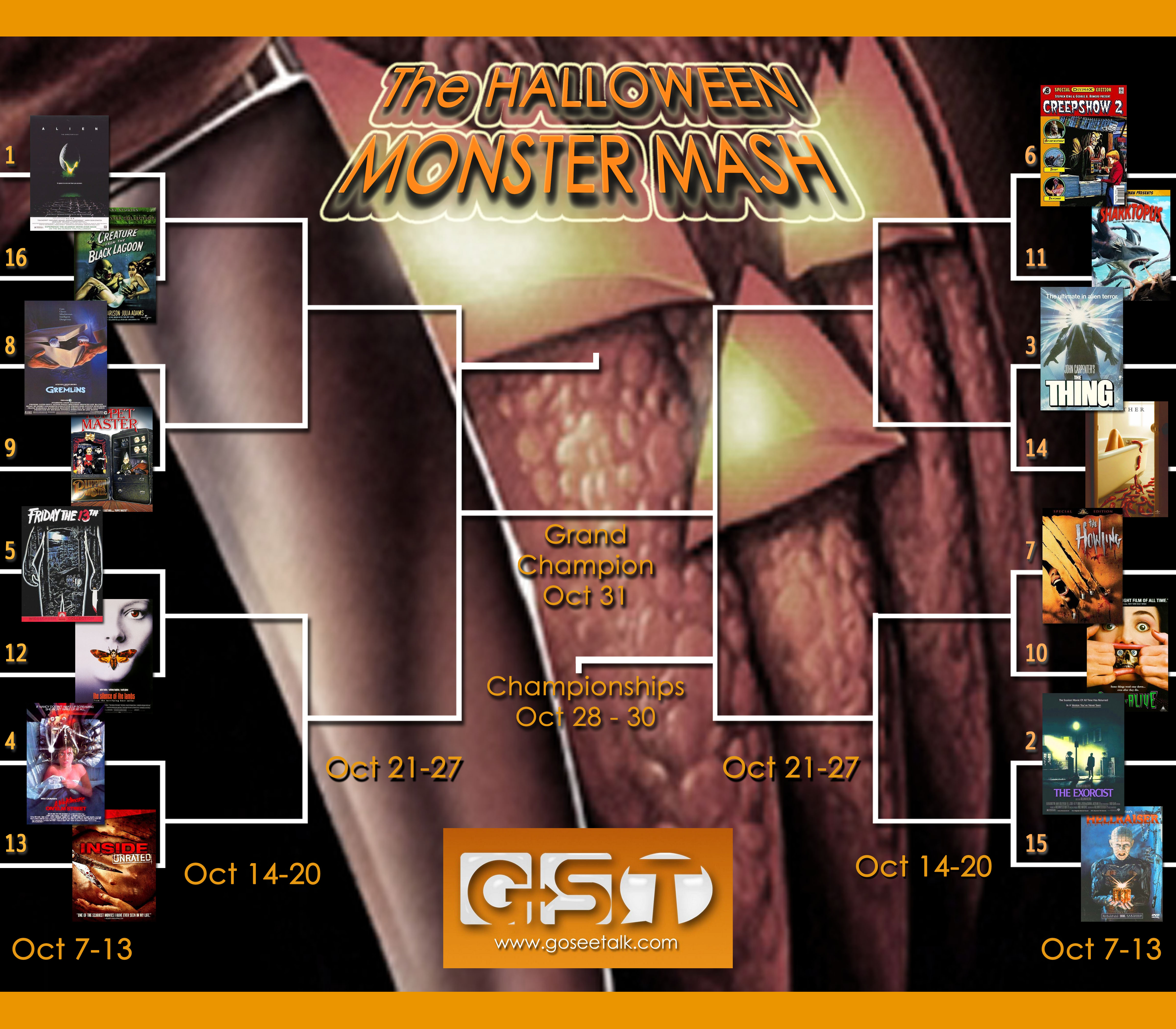 2.) One reader with the most predicted bracket wins will win a trio of scary movie titles – you tell us the three films you want on BluRay/DVD (whether they’re in the tournament or not) and we’ll send them to you at the end of the month. (To enter, email your bracket predictions to marc@goseetalk.com by OCTOBER 10th.)
