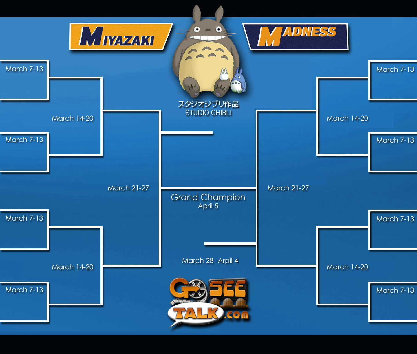 | Studio Ghibli/Miyazaki Madness Championship | March 28-April 4 |