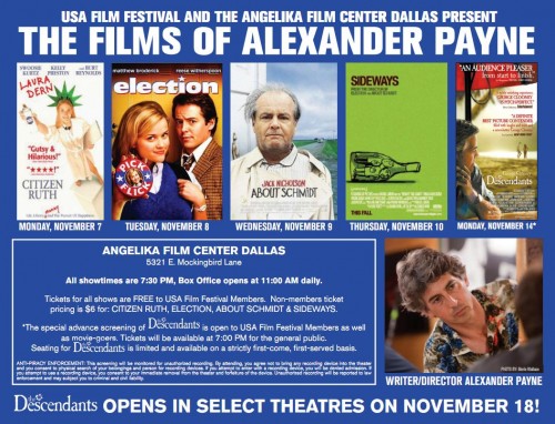 In support of the upcoming Fox Searchlight Pictures’ film, The Descendants, the USA Film Festival will be hosting an Alexander Payne retrospective at the Angelika Film Center in Dallas. USA FF members get in free and ticket prices are $6 for general public. Below is the banner which notes the screenings of Payne’s previous films are Monday-Thursday next week with a special ADVANCED SCREENING of The Descendants on November 14th. Have a look at the dates and times and hope you fans can make it out to a screening or two.